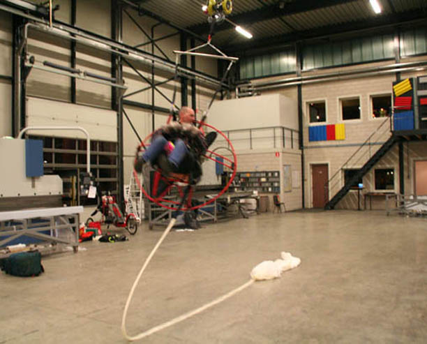 De praktijktraining was er op gericht om een werkelijke situatie na te bootsen. De cursisten werden opgelierd en met een touw naar voren getrokken. Je moest het touw zelf met een snelsluiting lostrekken. Dit werd gedaan met de hand waar je ook je reserve mee moest trekken. Anders zou je met de andere hand je reserve hendel al vast kunnen houden. Het was juist de bedoeling, dat je tijdens de flinke zwieper je reserve handel kon vinden en ook op de juiste manier trekken. Vlieg je ook in de winter, dan is het leerzaam om deze oefeing met dikke winterhandschoenen te doen. Bedenk hierbij in welke hand je je gashendel vast hebt. Misschien moet je met je andere hand de reserve trekken. Dit kon je allemaal beoefenen.